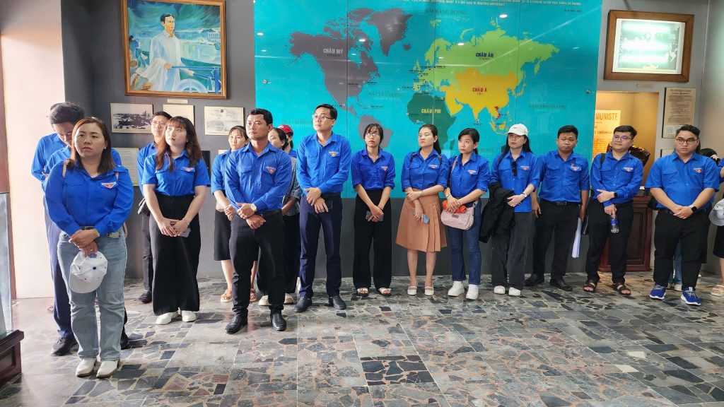 Đoàn tập trung nghe thuyết minh về những năm tháng bôn ba nước ngoài của thanh niên yêu nước Nguyễn Tất Thành